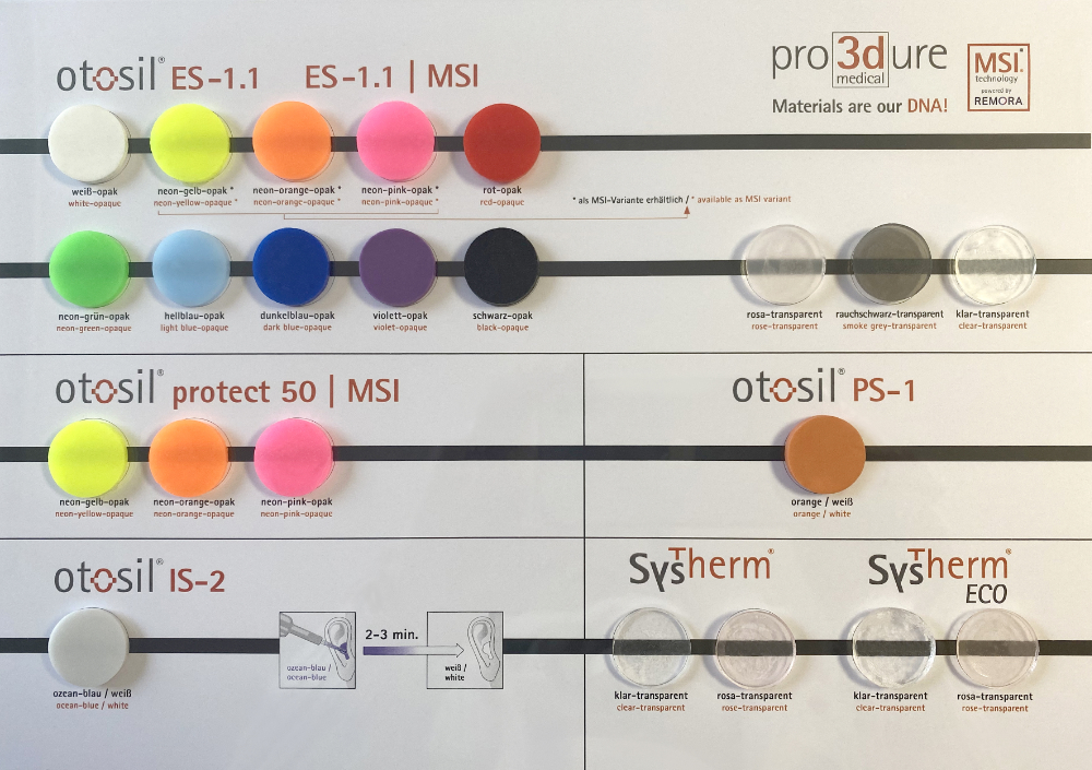 Die Otoplastik-Silikone der otosil® ES-1.1 Serie bieten Ihnen alles, was Sie von modernen Silikonwerkstoffen für flexible Ohrpassstücke erwarten. Erhältlich in den Shore A Härten 25, 40 und 60 und einer großen Anzahl unterschiedlicher Farben. Durch die optimierte Einstellung der Fließeigenschaften der Materialien lassen sich insbesondere generativ gefertigte Gussformen ohne Luftblasen mit niedrigem Auspressdruck effizient und kontrolliert befüllen. Durch eine neuartige Vernetzermatrix kann eine außergewöhnliche Kombination von hoher Reißdehnung mit hohen Werten für Weiterreißfestigkeit und Reißfestigkeit garantiert werden. Dies führt zu einer Reduktion von Mikrorissen der Ohrpassstücke beim Entformen des Materials. Die Verarbeitungszeit im Drucktopf bei 50 °C liegt bei 60 min. otosil® ES-1.1 | MSI reduziert, durch die zusätzliche Implementierung der MSI® Technologie, die Adhäsion von Biofilmen auf natürliche Art und Weise an der Oberfläche von Ohrpassstücken. So wird die Hygiene im Ohr gezielt verbessert.