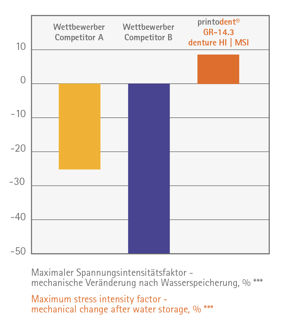 Das Ergebnis unserer stetigen Entwicklungstätigkeit ist das neue printodent® GR-14.3 denture HI | MSI, welches durch außergewöhnliche mechanische Eigenschaften charakterisiert ist. Im Vergleich zu seinen Marktbegleitern bleiben die mechanischen Eigenschaften auch nach Wasserlagerung signifikant stabiler. Als weiteres Mitglied der printodent® Familie ist auch das printodent® GR-14.3 denture HI | MSI mit der MSI® Technologie zur Reduzierung von Biofilmen ausgestattet. In Kombination mit herausragenden chemisch physikalischen Eigenschaften besitzen Prothesen aus dem Material einen auf die Körpertemperatur hin optimierten Thermoeffekt, durch den ein extrem hoher Tragekomfort generiert wird. Alle Materialien der printodent® GR-14 denture Serie können selbstverständlich mit dem printodent® GR-17.1 temporary lt kombiniert werden, um kostengünstige und hochästhetische Vollprothesen zu fertigen. Darüberhinaus stehen für beide Materialien validierte Verfahren in Kombination mit Prothesenzähnen der Systeme VITA VIONIC VIGO, CANDULOR TCR° / NFC+° und Ruthinium ACRYSMART zur Verfügung. Eine vollständige Integration in exocads CAD-Software rundet den digitalen Workflow ab.