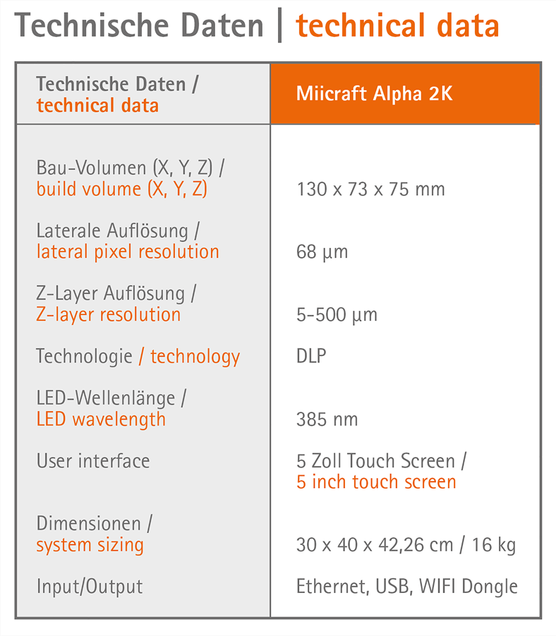 The new MiiCraft Alpha 2K desktop 3D printer is characterized by its compact size. With a build space of up to 130 mm in length and exceptionally high resolution for precise printing (1980 x 1200 pixels with XPR™), it enables extremely accurate results. The build platform and resin tank are designed for user-friendly handling and the acrylic covers are open on three sides to provide a larger workspace.