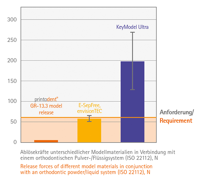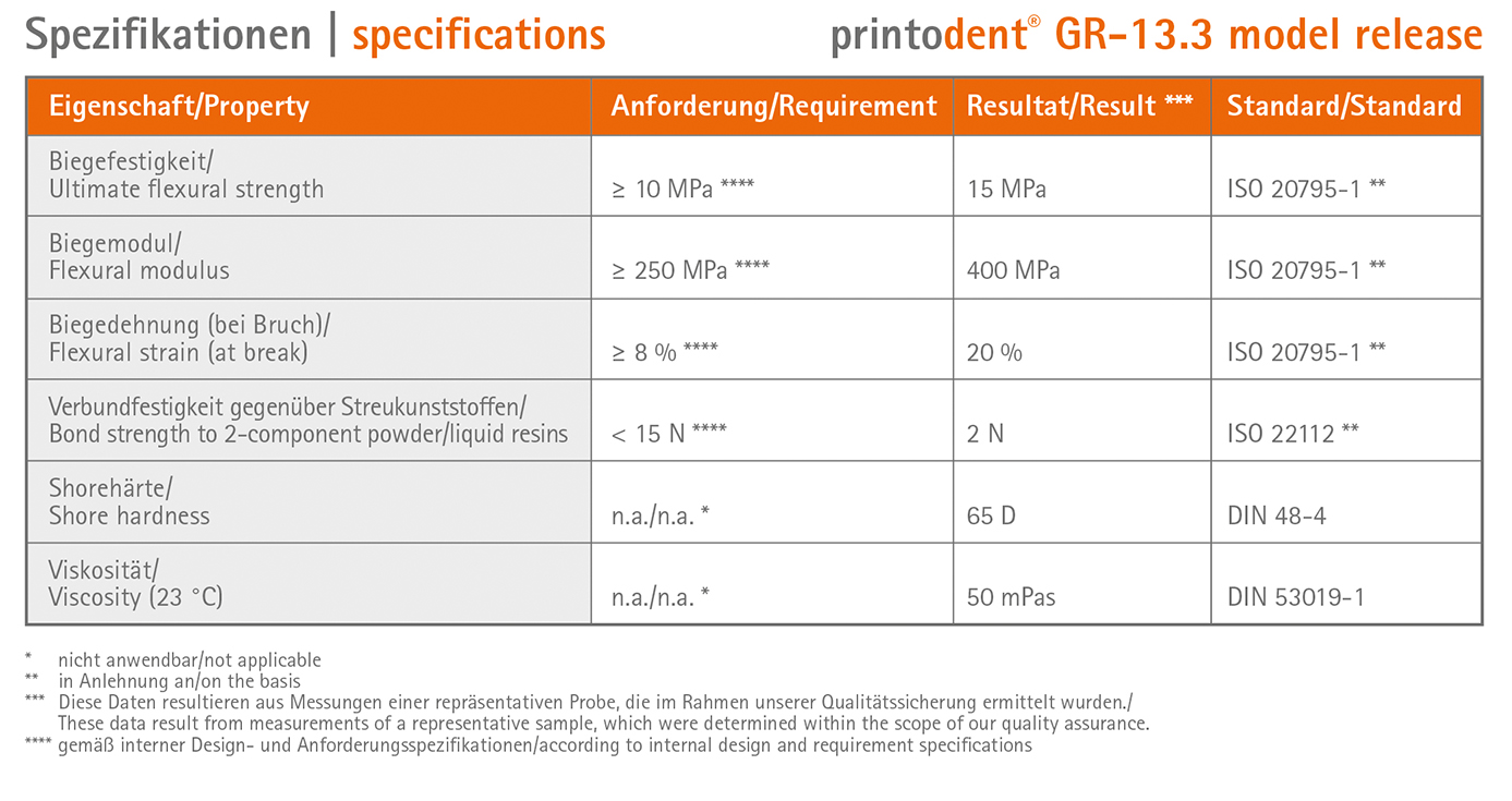 printodent® GR-13.3 model release wurde speziell für kieferorthopädische Applikationen entwickelt und macht den Einsatz von Isoliermitteln bei der Nutzung von Streukunststoffen mit 3D-gedruckten Dentalmodellen überflüssig. Durch pro3dures neue „Release”-Technologie ist es erstmals gelungen, ein Material zur Verfügung zu stellen, welches einen integrierten Separationseffekt aufweist. Dies ist nicht auf den Zusatz von Füllstoffen wie z. B. Wachsen zurückzuführen, die sich von der Harzmatrix entmischen und so zu instabilen Bauvorgängen oder fehlerhaften Bauteilen führen können. Aufgrund seiner niedrigen Viskosität lassen sich Bauteile aus printodent® GR-13.3 model release ferner leicht reinigen und ermöglichen so einen effizienten Nachbearbeitungsprozess. Es ist zudem für viele orthodontische Pulver-/Flüssigsysteme geeignet.