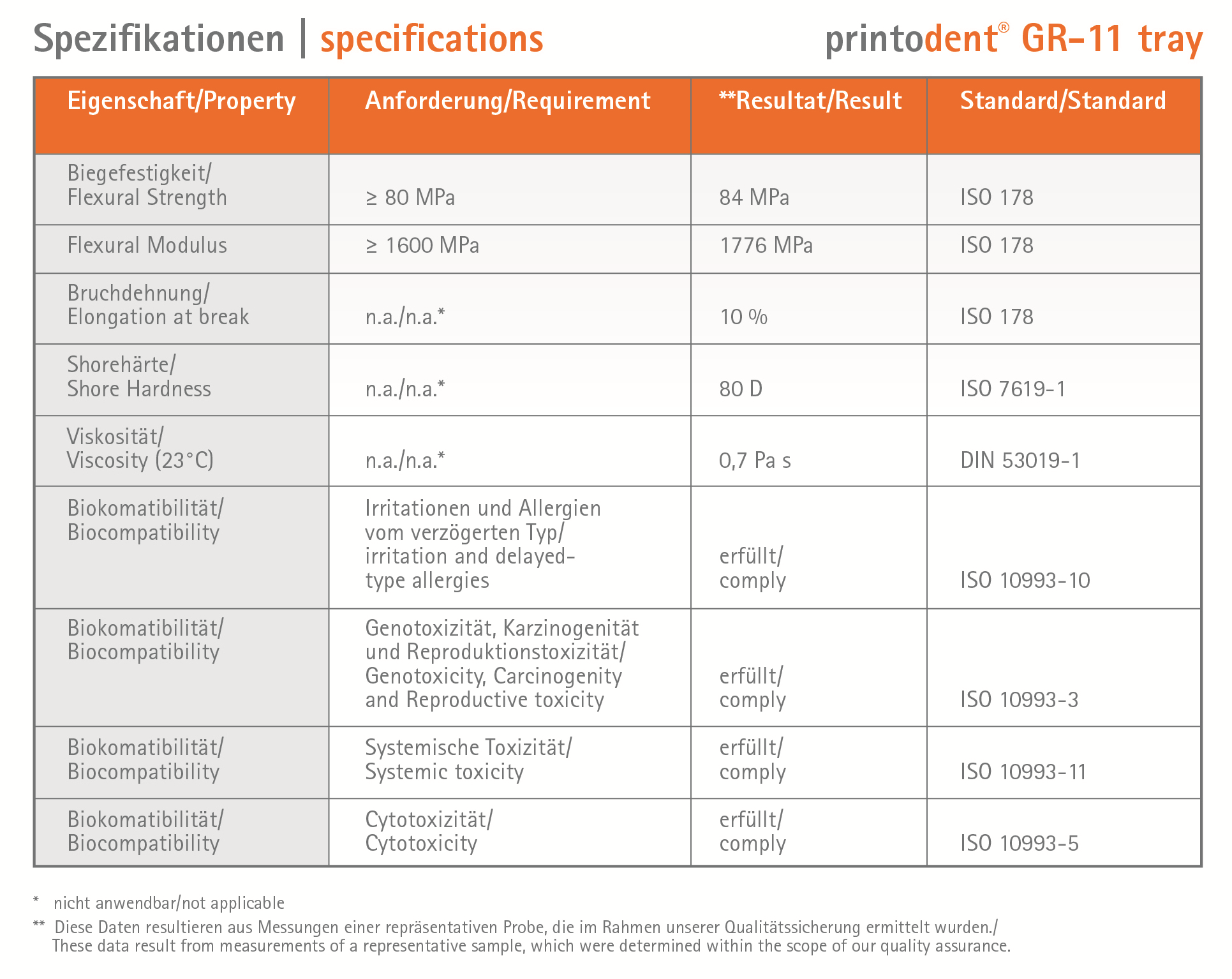 pro3dures printodent® GR-11 tray ist ein biokompatibles 3D Printing-Harz für die generative Herstellung individueller Abformlöffel. Aufgrund seiner hohen Reaktivität lassen sich Buildstyles mit bis zu 300 μm z-Höhe realisieren, um effizient im Labor zu sein. Die hohen Dehnungswerte des GR-11 tray machen die Abformung für den Behandler und Patienten angenehm und sicher.