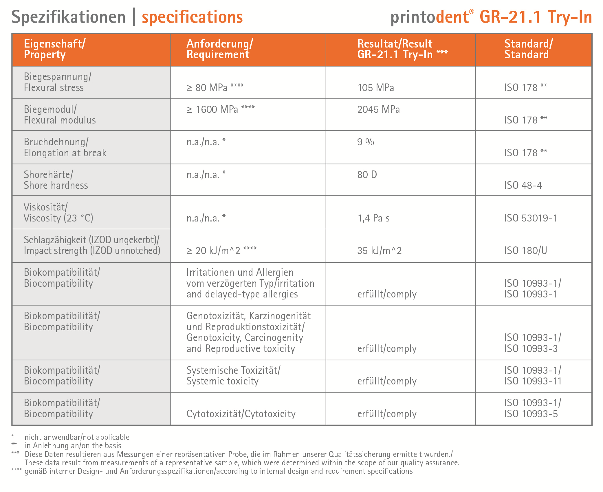 printodent® GR-21.1 Try-In ist ein biokompatibles Medizinprodukte der Klasse 1 und eignet sich als Basismaterial zur Funktionseinprobe von digital gefertigten Prothesenbasen. Es können mit printodent® GR-21.1 Try-In dentale Formteile wie Prothesenbasen mit individueller Zahnaufstellung generativ gefertigt werden, um eine Funktionseinprobe zur Überprüfung der Bissregistrierung und Okklusion vorzunehmen. Das Material ist in den Zahnfarben A1, A2 und A3 erhältlich. Das neuentwickelte printodent® GR-21.1 Try-In zeichnet sich durch signifikant verbesserte chemisch physikalische Werte im Vergleich zu den Marktbegleitern aus. So konnte die Schlagzähigkeit (nach ISO 180/U) im Vergleich zum Vorgänger um 75 % erhöht werden. Duch den Einsatz eines neuartigen Initiatorsystems konnte die Biokompatibilität und somit die klinische Sicherheit nochmals erhöht werden.