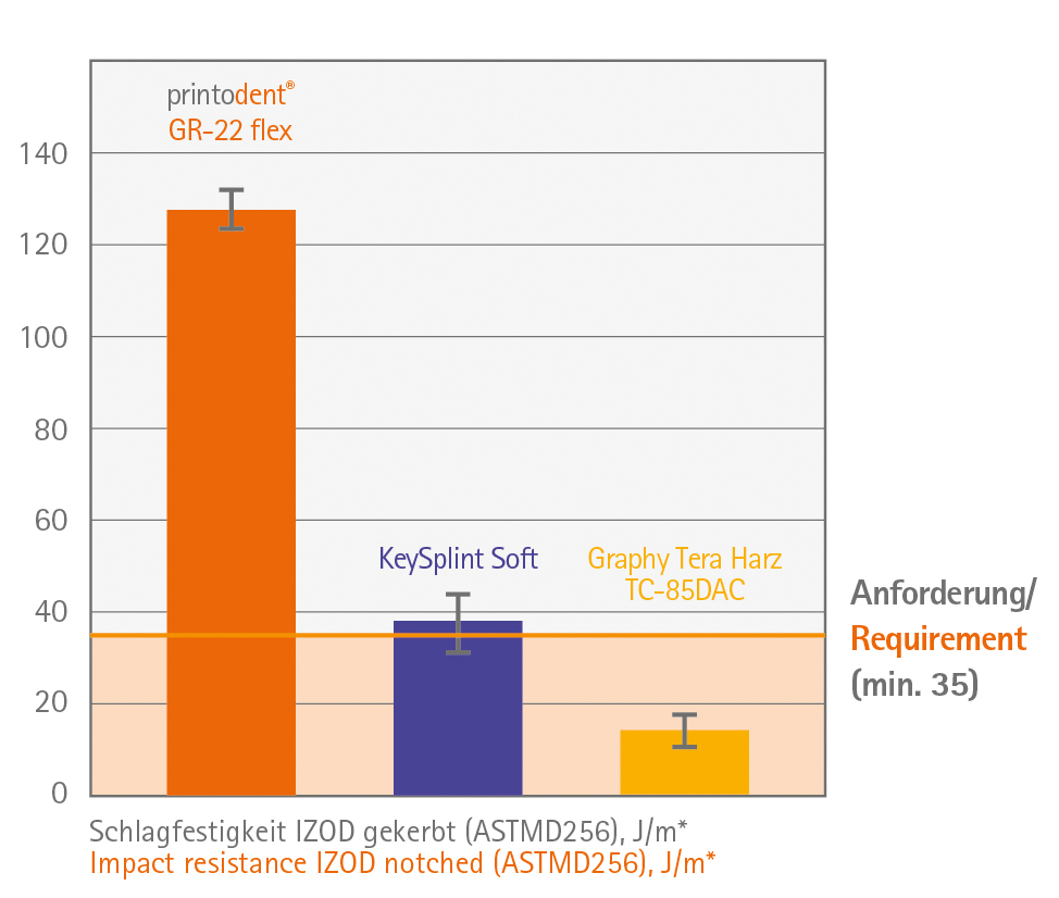 pro3dures printodent® GR-22 flex ist das innovative Harz für den 3D-Druck von Splints mit einzigartiger Schlagfestigkeit bei gleichzeitig hoher Bruchdehnung. Seine besonderen zähelastischen Eigenschaften in Kombination mit einem Thermoeffekt vereinen höchsten Tragekomfort mit höchster Biokompatibilität.